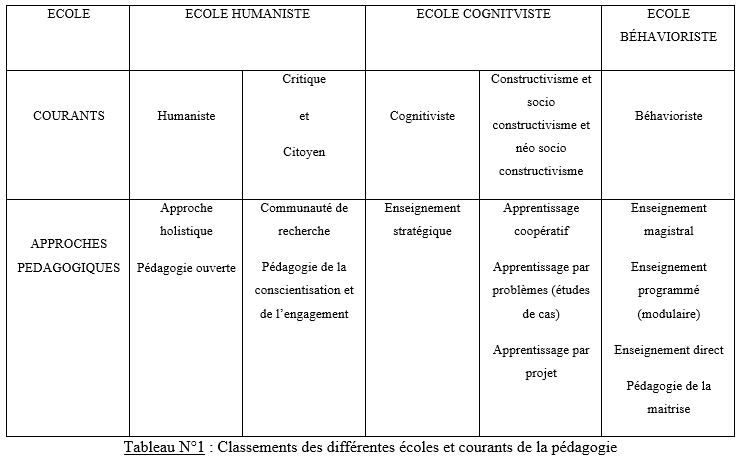 De nos jours, il existe de nombreux classements des différentes écoles et courant pédagogiques. Nous avons choisi de nous inspirer du livre « Apprentissage et enseignement : théories et pratiques » de Vienneau (2005) afin de dessiner le tableau suivant . Il nous parait plus accessible que plusieurs autres auteurs ayant tenté l’exercice (exemple : Joyce et Weil  1996 ; Paquette 1995 ; Eisner et Vallance 1974 ; Bertrand 1998).