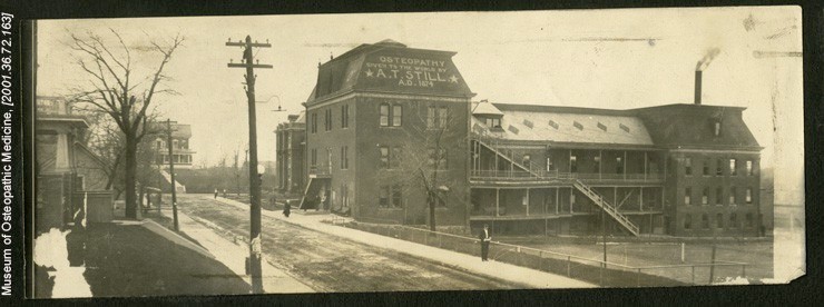 En novembre 1892, Andrew Taylor Still fonde la première école d’ostéopathie : l’American School of Osteopathy, à Kirksville. Ses premiers étudiants sont des scientifiques et des médecins, et ses enfants font partie des premiers diplômés.